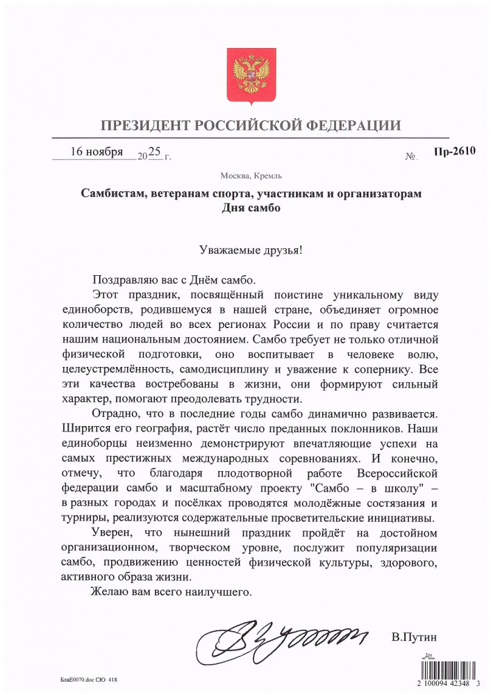 Свое приветствие самбистам направил Президент РФ Владимир Путин, а резидент FIAS Василий Шестаков отметил, что самбо в ближайшее время может войти в программу Олимпийских игр.