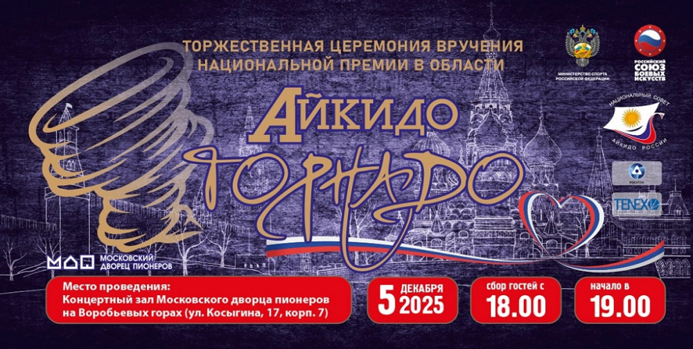 5 декабря в Концертном зале Московского дворца пионеров на Воробьевых горах (ул. Косыгина, 17, корп. 7) пройдет одно из наиболее ярких событий года в области боевых искусств - торжественная Церемония вручения национальной премии «Торнадо» - премии Национального Совета Айкидо России в области развития и популяризации боевого искусства айкидо!