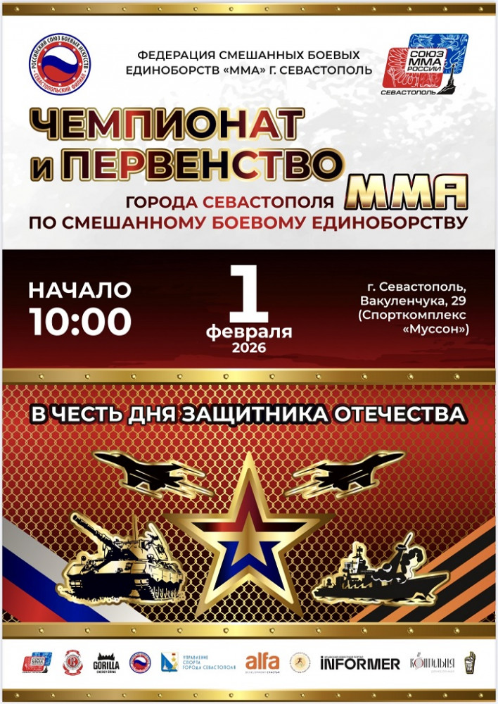 В СК «Муссон» пройдут масштабные городские соревнования - Чемпионат и Первенство Севастополя по смешанному боевому единоборству (MMA). Мероприятие посвящено предстоящему Дню защитника Отечества, что добавляет ему особую, патриотическую значимость.