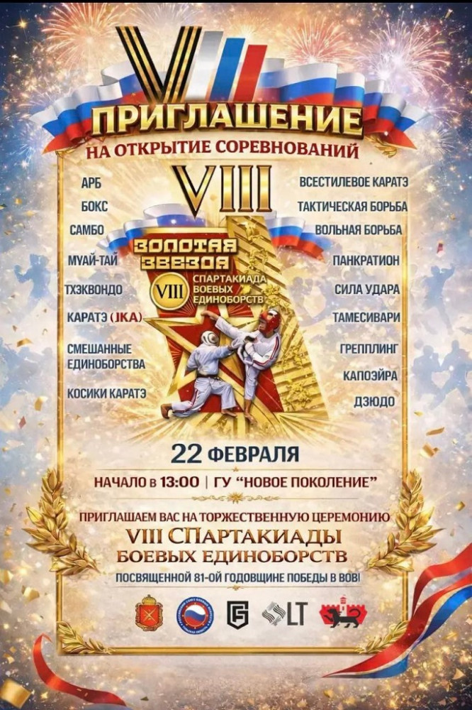 22 февраля 2026 года в С/К «Новое поколение» (г. Тула, ул. Металлургов 22А) пройдет I этап VIII Спартакиады боевых единоборств "ЗОЛОТАЯ ЗВЕЗДА", посвященной 81-й годовщине Победы в Великой Отечественной войне.